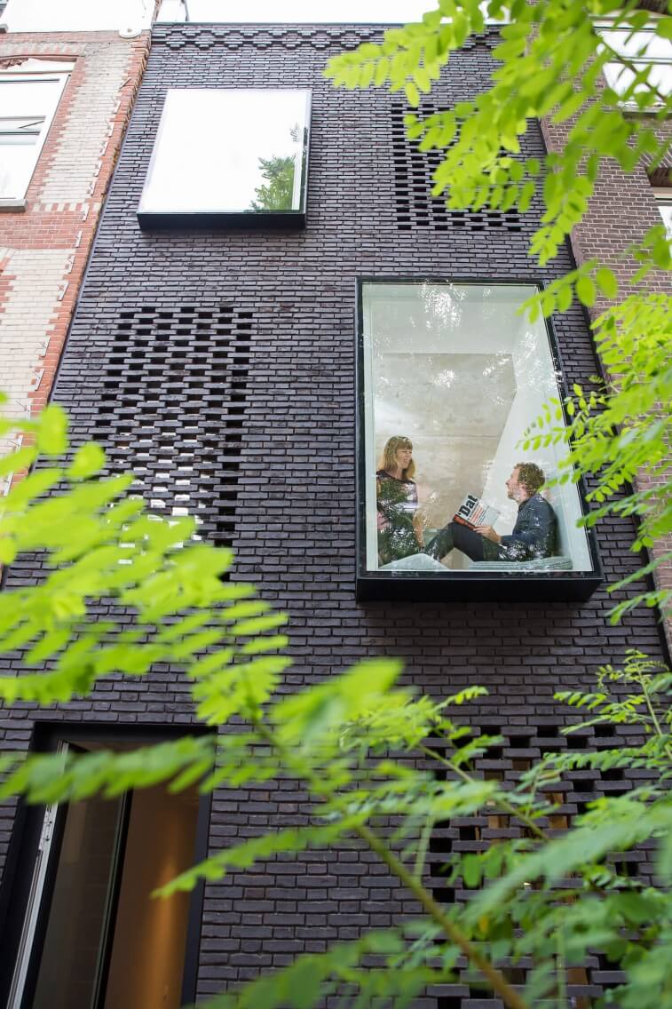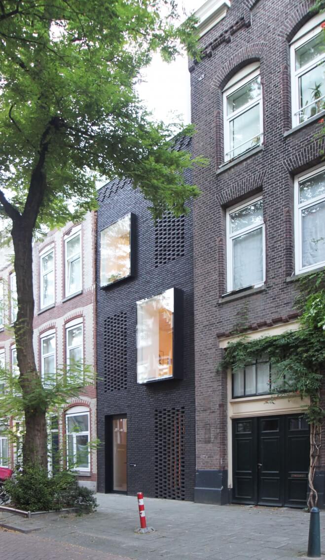 De ritmiek en verhouding van de gevelopeningen in de straat is overgenomen in de nieuwe voorgevel. Door de materialisatie in zwarte baksteen en een afwijkende vormgeving van de vensters manifesteert het huis zich tegelijkertijd ook duidelijk als een nieuwe ingreep. De volledig transparante voordeur geeft zicht op de verborgen binnentuin terwijl het naastliggende raam schuil gaat achter een voile van Braziliaans metselwerk. Ook op de verdieping biedt Braziliaans metselwerk bescherming tegen inkijk en de felle middagzon. De achtergevel is veel transparanter van karakter voor een maximale verbinding met de tuin.