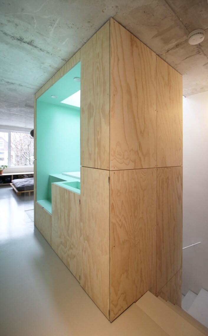 De leefvertrekken op de begane grond en de eerste verdieping zijn georiënteerd op de tuin. Een centrale kern met voorzieningen staat los van de zijwanden, en definieert losjes de verschillende plekken in het huis. Hierdoor is de volle diepte van de woning overal voelbaar, terwijl een vide voor verticale en diagonale doorzichten zorgt.