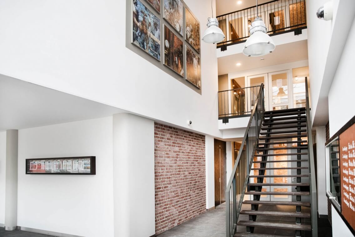 De oorspronkelijke, nauwelijks herkenbare entree van het gebouw is getransformeerd tot een ruime entreehal over drie bouwlagen. Ter plaatse van de centrale liften zijn bijna alle verdiepingen door middel van vides met elkaar verbonden.