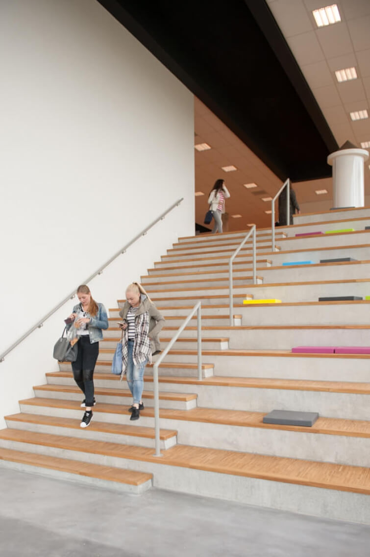Het bovenste volume, aan de buitenkant voorzien van rode lamellen, bevat vooral onderwijsruimtes en lokalen. De naastgelegen praktijkruimtes en werkplaatsen werden grondig gerenoveerd en ook een ouder bouwvolume dat ooit in gebruik was als kantine zal nog worden gerenoveerd om ruimte te bieden voor het werken met de nieuwste computergestuurde technieken. In het interieur bepalen verzorgde houten details het beeld.