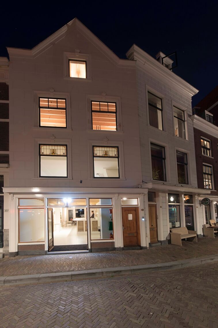 Een bestaand grachtenpand is getransformeerd tot een welzijnsvoorziening voor de buurt, met een ruimte voor kinderen en jongeren op de eerste verdieping, en een appartement bovenin. Het inloophuis biedt een laagdrempelige welzijnsvoorziening die verbonden is aan de Pelgrimsvaderkerk aan de overkant van de gracht. Voor de renovatie is de historische hoofdvorm als uitgangspunt genomen. Vanuit Welstand is alleen de voorgevel aangemerkt als beeldbepalend. Deze is intact gehouden terwijl de achtergevel is vervangen door wit bepleisterde houtskeletbouw, duurzaam en een zo licht mogelijke belasting voor de fundering. De begane grond en de eerste verdieping kregen een rustige sobere inrichting die recht doet aan de kwaliteiten van het pand. De woonverdiepingen zijn georganiseerd rond de twee verschillende kappen en de toegang via een nieuw trappenhuis. Aan de achterzijde is een dakterras toegevoegd.