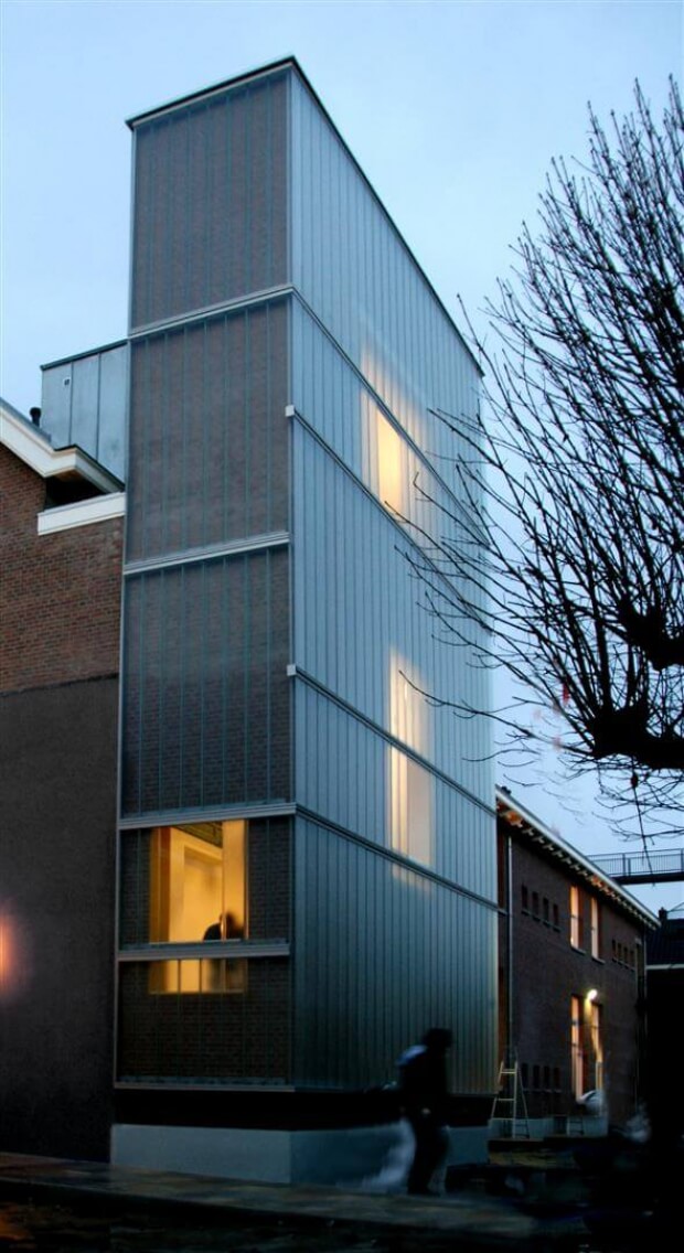 Met de transformatie naar 20 studentenwoningen is het van alle oneigenlijke toevoegingen ontdaan en vanuit die pure staat subtiel bewerkt naar een karaktervol woongebouw. De heldere opzet met hoofdtrappenhuis, brede gelede gangen en compacte klaslokalen is daarbij in ere hersteld en met een galerijdek uitgebreid t.b.v. woningen op de zolderverdieping.