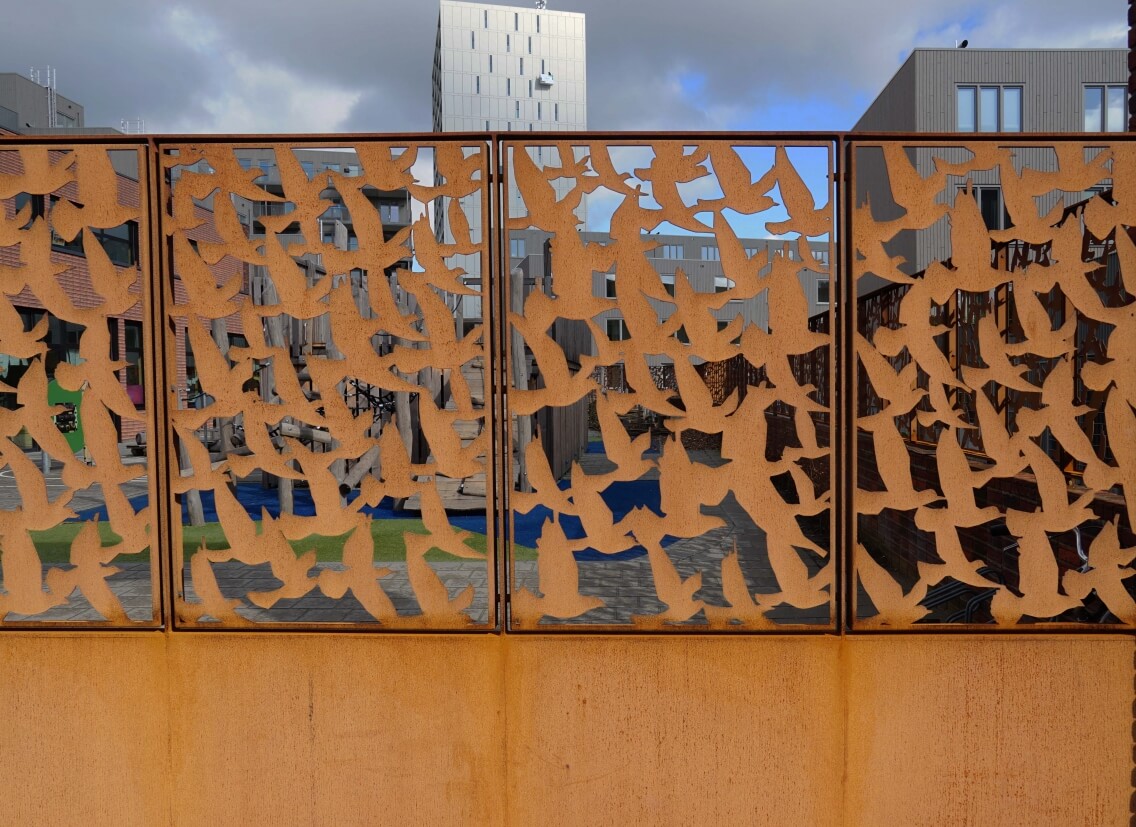 Het gebouw bestaat uit overzichtelijke clusters van onderwijsruimten. De gemeenschappelijke aula en speellokaal vormen de spil waar alle clusters direct mee verbonden zijn, en functioneert als centrale verkeersruimte. Het organiseert de tegenstelling tussen dynamiek en rust, en genereert de condities voor de kerntaak van de school. Gericht zich op samenleven en gelijke kansen, emancipatie van kind én ouder, en zo het verwerven van vrijheid. Het past bij de naamgever van de school. De opvliegende vogels in de vormgeving van het hek verwijzen ernaar.