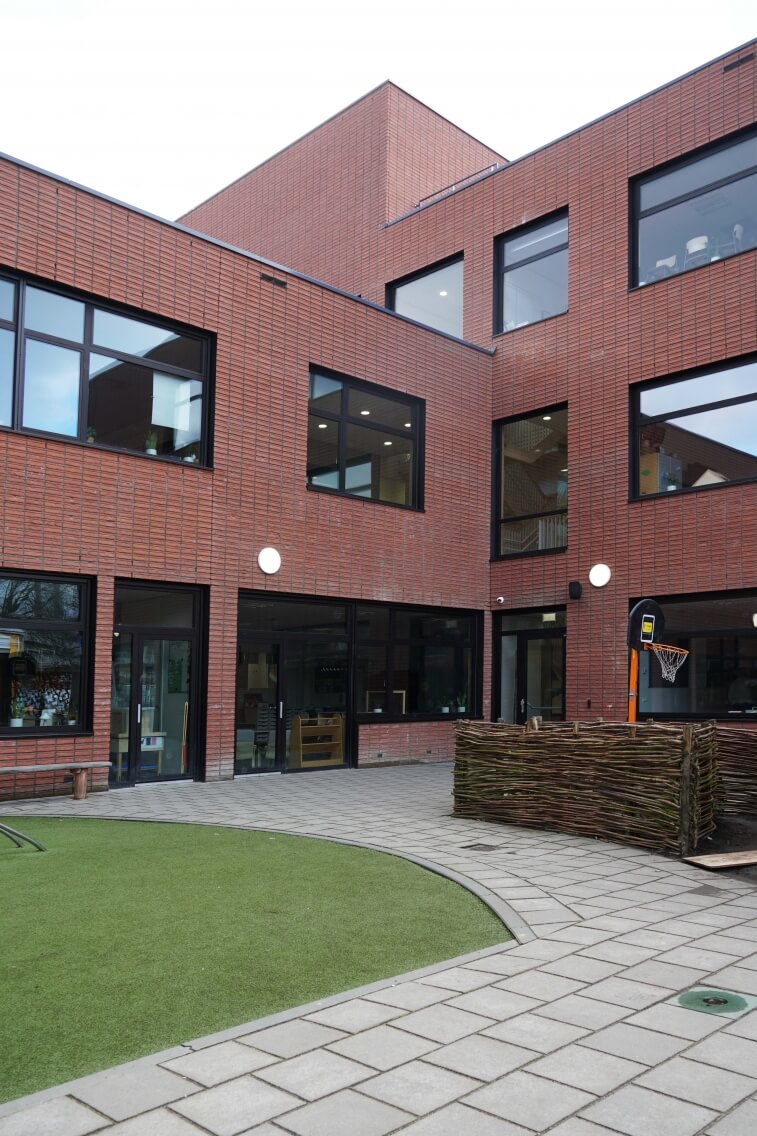 Met een transparante aula en “ouderkamer” richt het gebouw zich naar de straat, zodat zichtbaar is dat naast kinderen ook ouders in de school welkom zijn en de kloof tussen thuis en school zoveel mogelijk gedicht wordt. De muurschildering haaks op de Jacominastraat markeert het gebouw als centrale plek, zichtbaar vanaf de Krugerstraat.