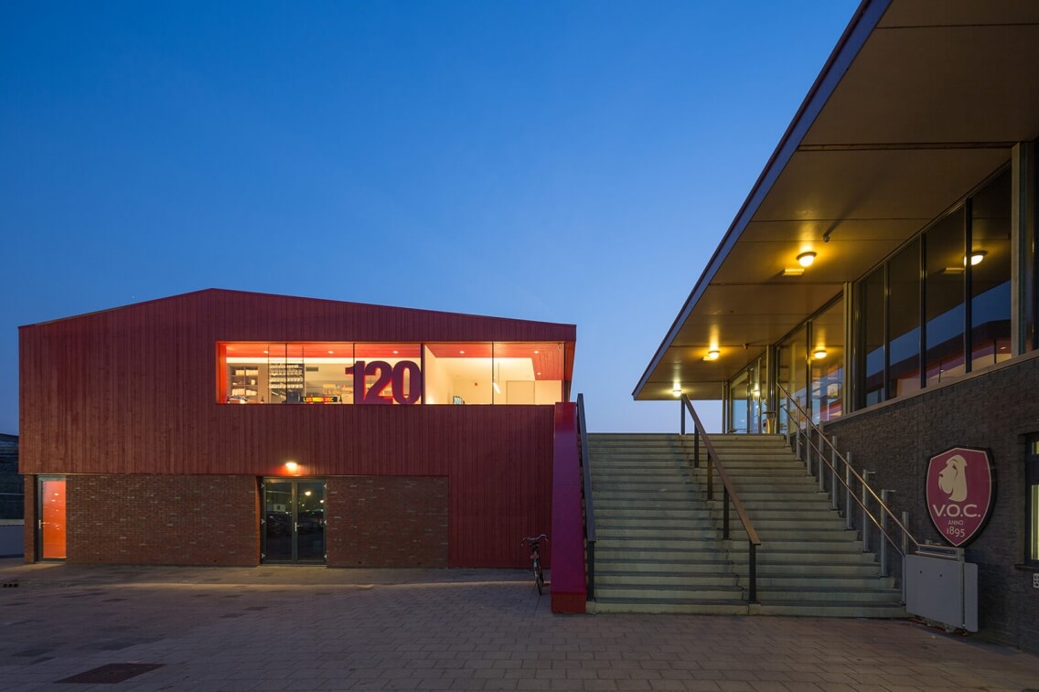 Haaks op het bestaande clubhuis van de Rotterdamse Cricket- en Voetbalvereniging V.O.C. uit 2004, werd een uitbreiding gerealiseerd. In samenhang met bordessen en trappartijen ontstaat zo een nieuw ensemble met meer kleedkamers, multi-functionele ruimtes, opslag, technische ruimtes en een beter gesitueerd kantoor voor de vestigingsmanager. Door zijn rode kleurstelling, en de gekozen dakhelling en overstek sluit het nieuwe clubhuis aan bij de oudbouw. De rode houten gevelbekleding wordt doorgezet in het interieur dat tevens door de architecten is ontworpen. Volledig glazen puien en een open hoek zonder middenstijl garanderen hier een royaal uitzicht over de velden. Het project maakt deel uit van het onderzoeksproject Architect aan Zet waarbinnen de architect zowel de technische als de ruimtelijke toetsing verzorgt, gericht op een soepele aanvraagprocedure voor de omgevingsvergunning.