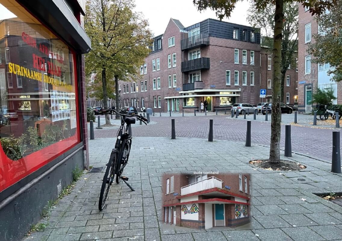 Voor de woningen waar het nu om gaat had de hoog-niveau-renovatie in de 80-er jaren een straat opgeleverd met, in de oorspronkelijke metselwerk-gevels, platte witte kunststof kozijnen, witte postpanelen en vlakke voordeuren in meerdere kleuren. Dakdozen met doorgaande lichtgrijze beplating zijn in de plaats gekomen van pannendaken. Het straatbeeld werd zo een vrij ongenuanceerde volkshuisvestelijke eenheidssaus. De grotendeels nieuwe samengestelde achtergevels bestonden uit grote monochrome (verkleurde) vlakken van asbesthoudende beplating, met weinig detail of nuance.
