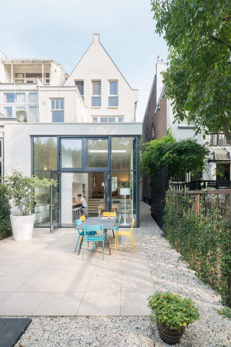 Grootschalige metamorfose van statig herenhuis met dakopbouw en uitbouw met inpandige tribunetrap.