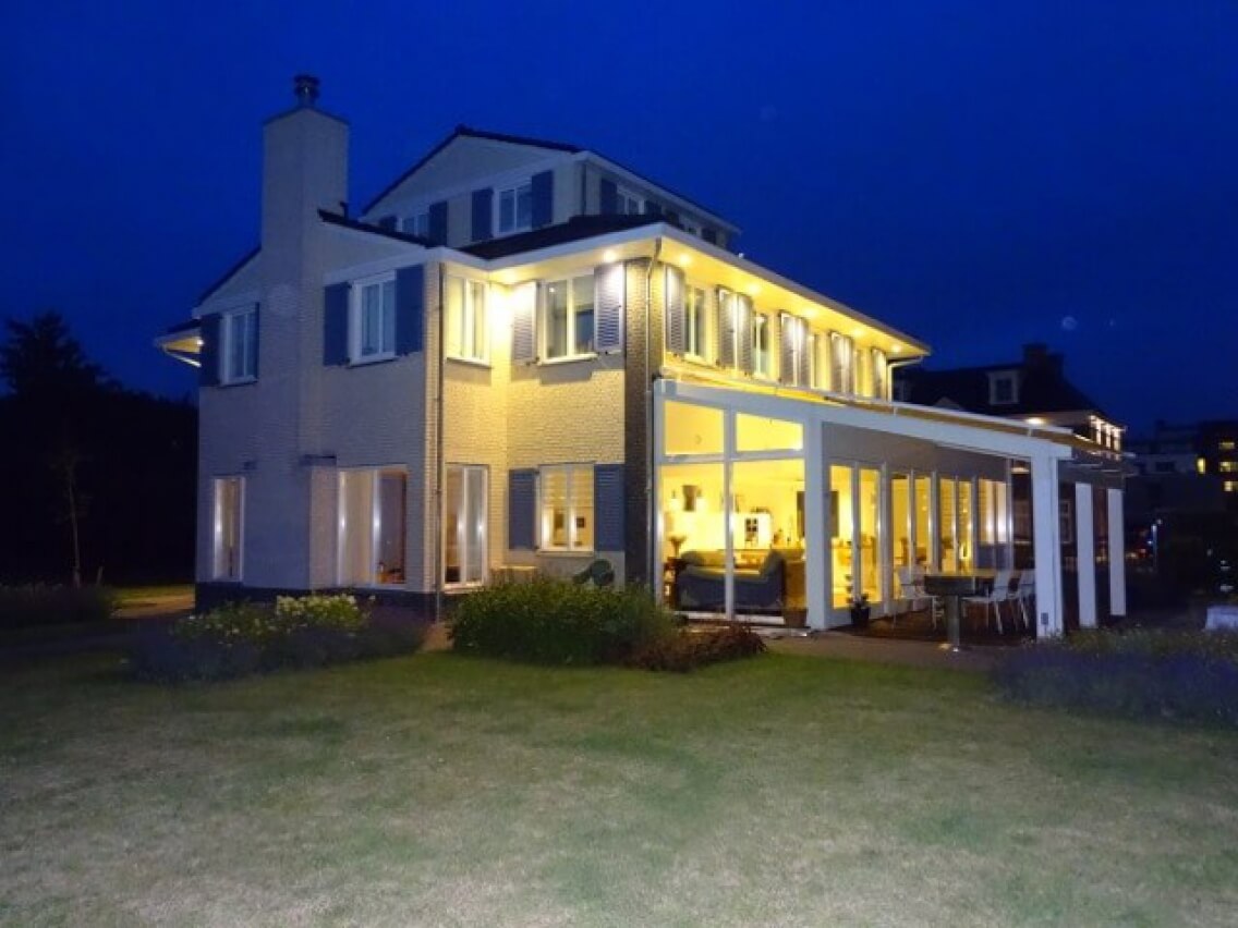 Op de begane grond is de plattegrond vormgegeven van de noord- naar de zuidzijde: van bibliotheek, werkkamer en televisiekamer, naar zitruimte met openhaard centraal naar de eet- woonkeuken, die vanuit het huis verlengd wordt in de lichte serre aan de zuidzijde. De strakke vormgeving met enkele expressieve Frans klassieke toevoegingen maakt dit een zeer prettige belevingsruimte. Op de verdieping bevinden zich de slaap- en was vertrekken gecentreerd rond de hal. De woning is met duurzame natuurlijke materialen en duurzame energieopwekking uitgevoerd en heef een kelder waarin ook een wijnkelder. Interieuradviezen Edwin van de Velde, Rotterdam.