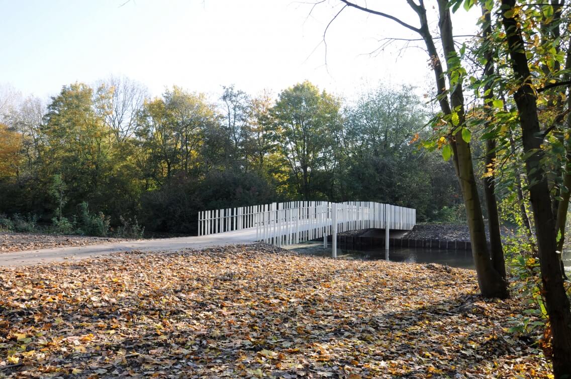 In Park Zestienhoven, een uitbreidingswijk in een waterrijke polder aan de noordrand van Rotterdam, wordt een reeks van 42 bruggen gerealiseerd. Het ontwerp is geïnspireerd op de traditionele polderbrug. Het constructieve basismodel is een simpele betonnen plaat over het water. De brugleuningen zijn geïnspireerd op de gevarieerde regelmaat van rietkragen. Vijf verschillende standaard staalprofielen kunnen op twee verschillende manieren en op verschillende afstanden van elkaar aan een stalen randplaat worden gelast. Zo ontstaan 'natuurlijke' onregelmatige patronen. Ook de benodigde tussensteunpunten en lantaarnpalen zijn vormgegeven als onderdeel van deze leuning. Er zijn drie verschillende familietakken: vlakke hoofdstructuurbruggen, gebogen binnenwereldbruggen en geknikte stijlrandbruggen. Samen versterken ze de polderidentiteit van de wijk.