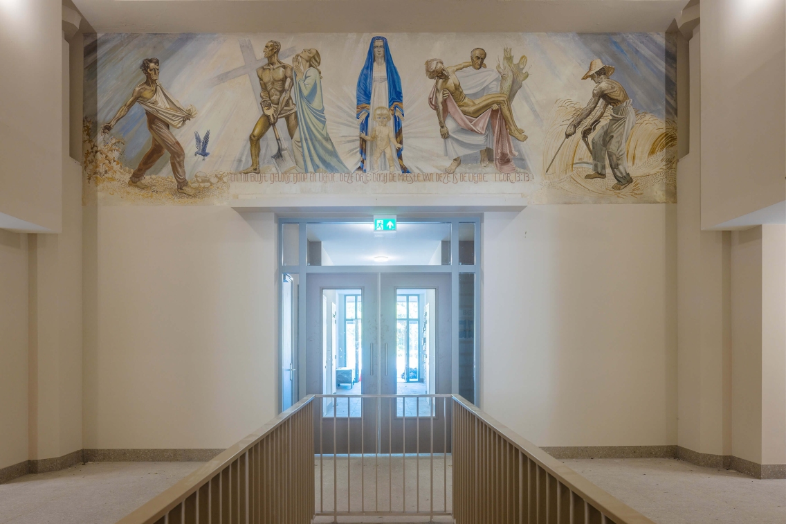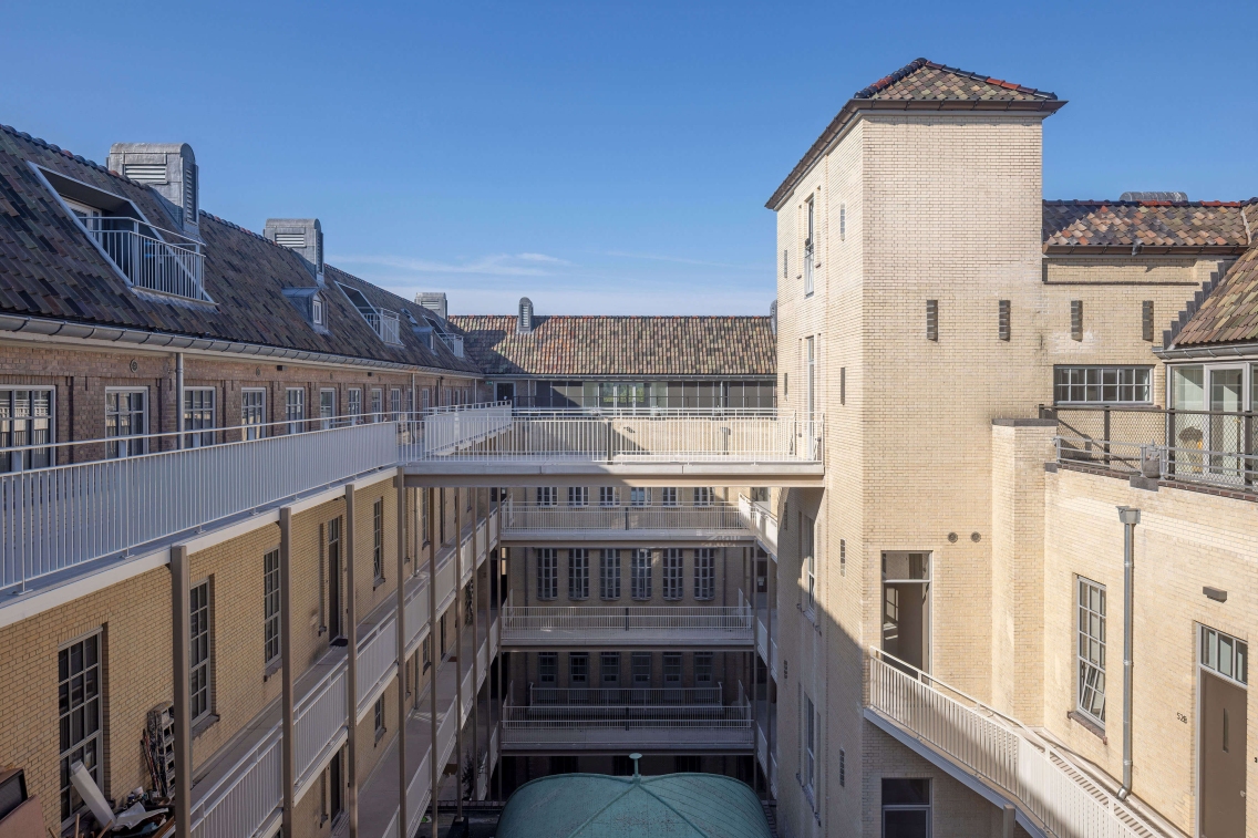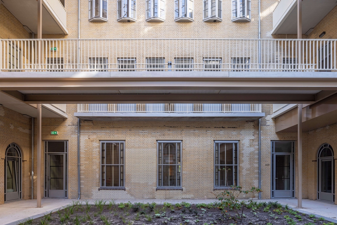 Aanpassingen zijn terughoudend: smalle balkons aan de begane grond, individuele balkons op de verdiepingen en brede balkons aan de zijgevels. De nieuwe hoofdingang ligt aan de achterzijde met een glazen aanbouw en luifel, terwijl de binnenhof via nieuwe galerijen bereikbaar is. De voormalige kapel is omgevormd tot gemeenschappelijke hal.